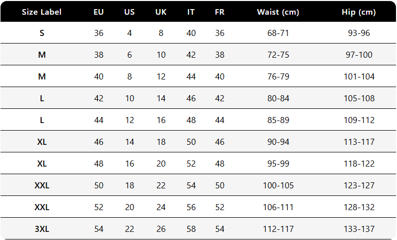 - Measurements: Waist and hip measurements are approximate and may vary by brand